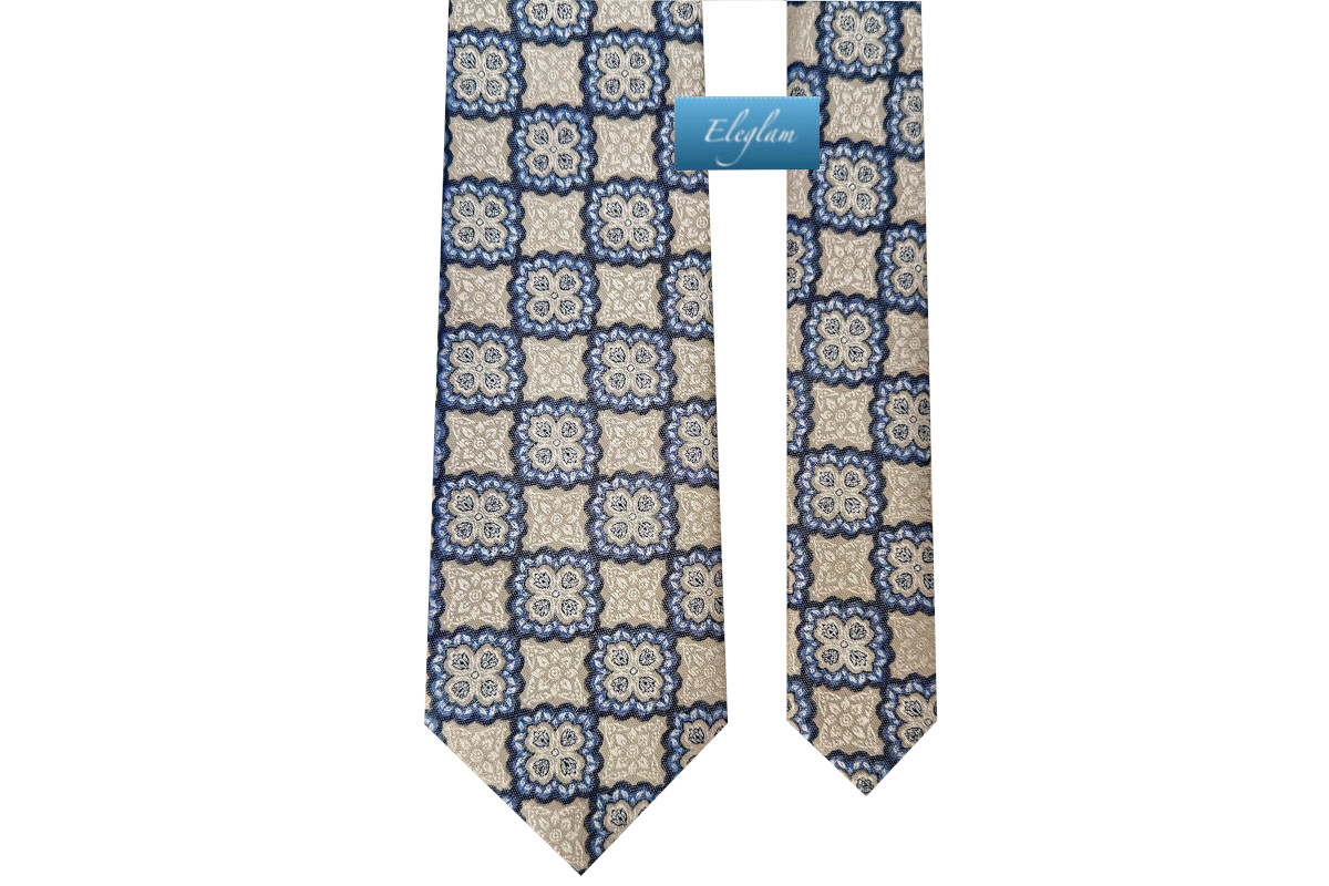 Corbata fondo beige con dibujos en tonos azules