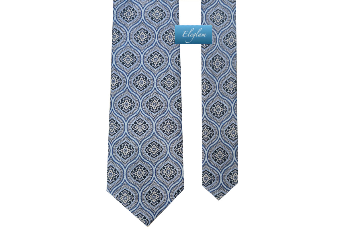 Corbata fondo celeste con dibujos de rombos en tonos azules