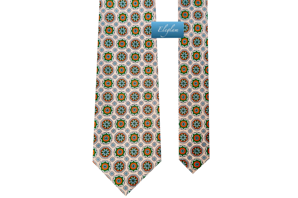Corbata fondo beige con motivos pequeños en tonos verdes y naranjas