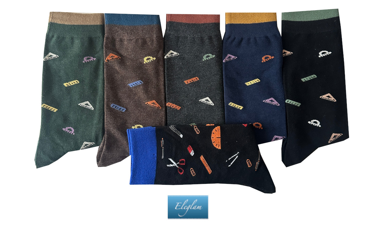 Calcetín con fondos negro, azul marino, gris, marrón y verde, y motivos de material escolar.