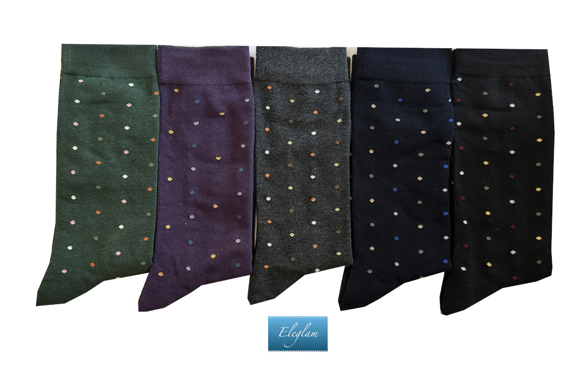 Calcetín de lunares con fondos verde, morado, gris, azul marino y negro para hombre.